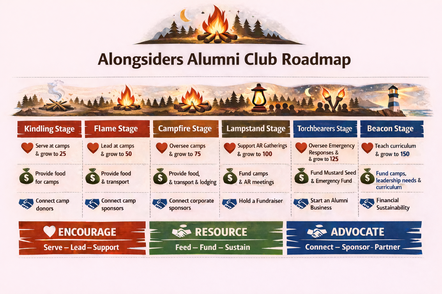 The Alumni Club Roadmap is built around the metaphor of fire. Every movement begins with a spark, grows into a flame, gathers people around a campfire, and eventually becomes a light that spreads far beyond its original source. In the same way, the Alumni Club grows step by step, with each stage strengthening and expanding the impact of the Alongsiders movement.